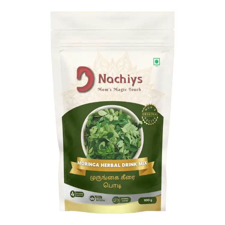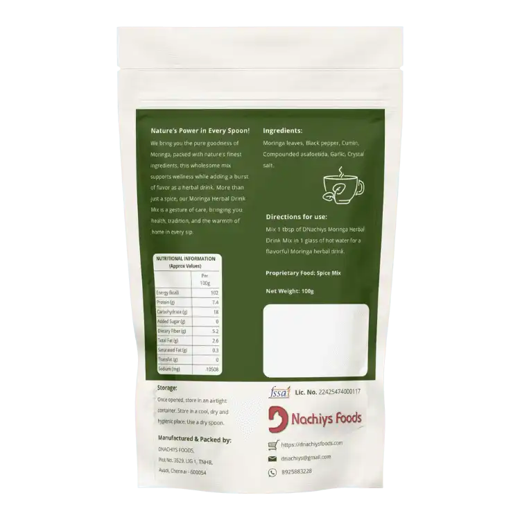 Meet the magic of moringa – wrapped in warmth, wellness, and DNachiys’ homemade touch. Our Moringa Herbal Drink Mix is crafted with the purest moringa leaves, gently dried and blended with spices like black pepper, cumin, and Compounded asafoetida for a daily dose of vitality.